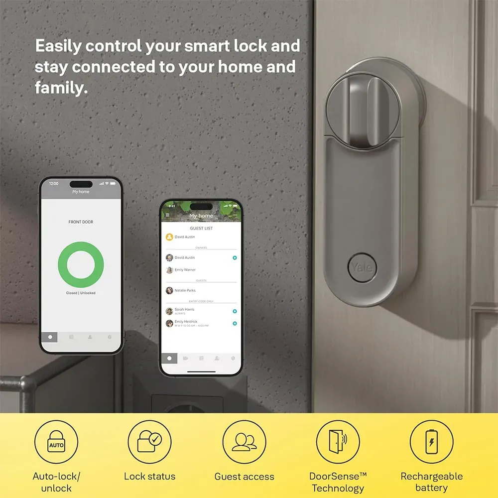 Transform your home security with the new Yale Linus Smart Lock L2 in Silver finish, the ultimate evolution of keyless entry. Now with integrated Wi-Fi and Bluetooth, you don't need additional bridges to control it from anywhere. Enjoy a lock that is twice as fast, silent and powerful, compatible with the Matter ecosystem. Its new rechargeable battery guarantees up to 6 months of autonomy, while DoorSense technology gives you total peace of mind by telling you if your door is really locked. Forget about physical keys and manage access for guests, family and services with total security from your mobile. It's the best smart lock to modernize your entrance in minutes.