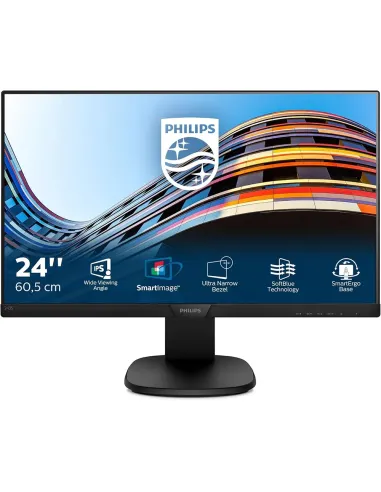 This model features: 60.5 cm (23.8″) size, Full HD 1920 × 1080 resolution at 60 Hz, 93 dpi pixel density, 250 cd/m² brightness, 1000:1 typical contrast, 5 ms response time (gray to gray) and 178°/178° viewing angles. Features SoftBlue technology, EasyRead mode, flicker-free, SmartImage function for automatic image optimization, ergonomic stand adjustable in height up to 130 mm, swivel -175/+175°, tilt -5°/20°, pivot 90°, VESA 100 × 100 mm mounting, 2 × 2 W speakers, typical power consumption around 11-14 W in active mode and <0.5 W in standby.