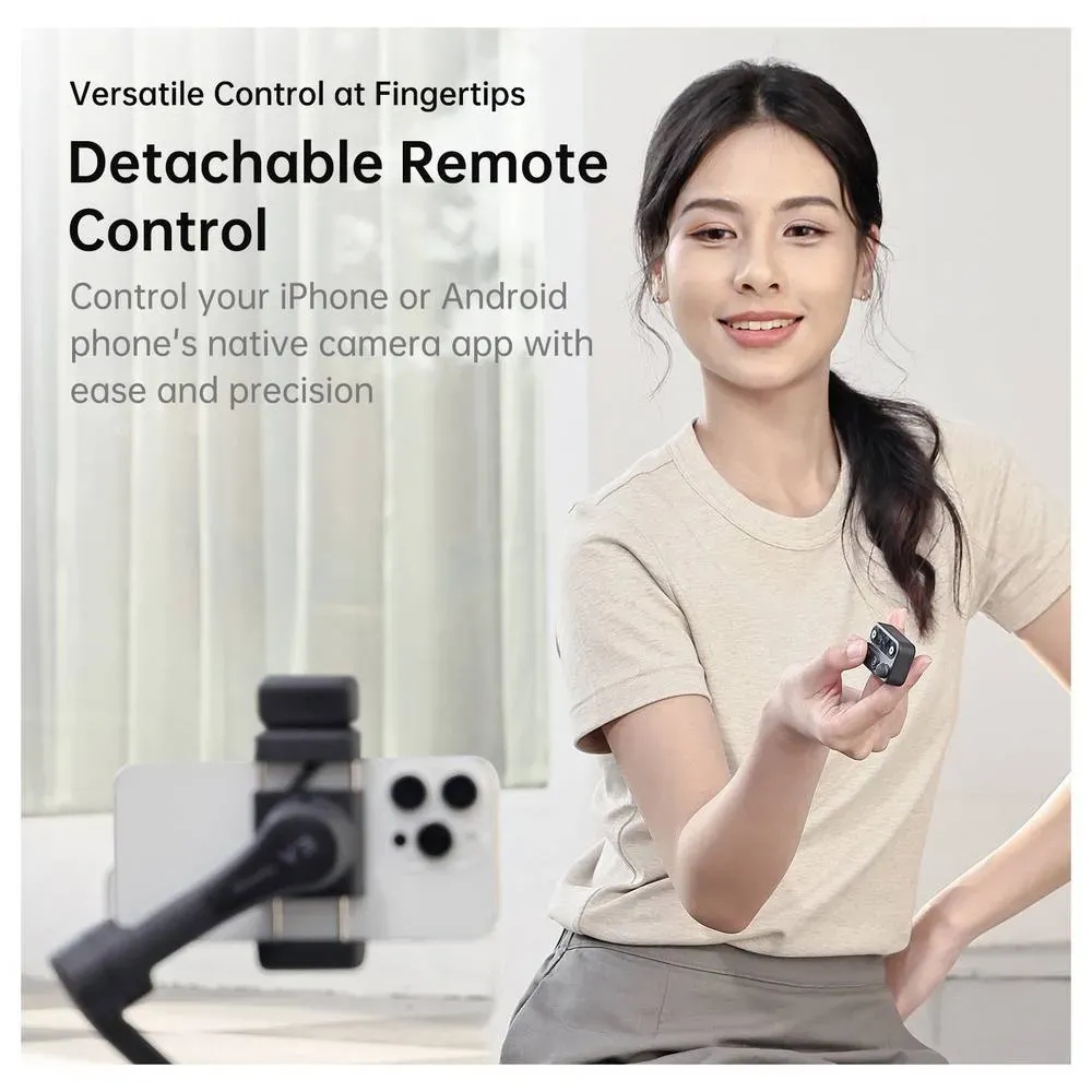 Built for maximum versatility, the iSteady V3 features a built-in 205mm extension rod, perfect for panoramic selfies and high or low-angle shots without bending over. Its handle unfolds into a stable tripod. Additionally, it includes a detachable remote control that allows you to operate the gimbal from a distance or attach it to the handle to charge while shooting.