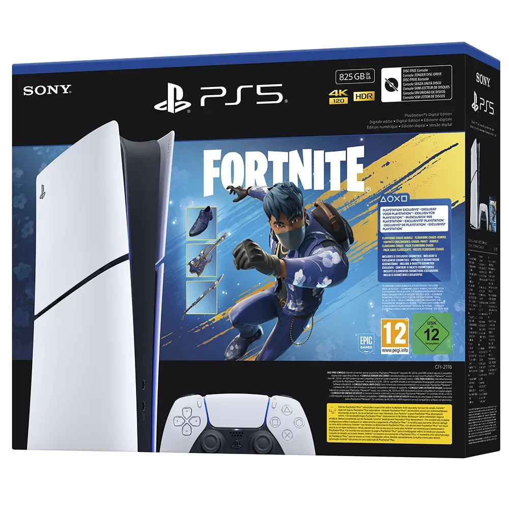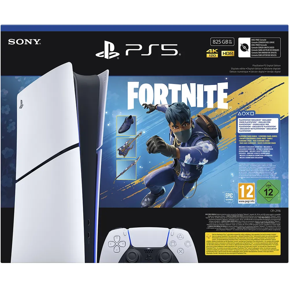 Step into the next generation of gaming with the PlayStation 5 Slim Digital Edition featuring the exclusive Fortnite Flowering Chaos bundle. This essential pack for fans includes 1,000 V-Bucks and 8 rare cosmetic items, such as the Florin Outfit and LEGO style, valued at approximately 5,000 V-Bucks. Experience breathtaking speed with an ultra-high speed 825GB SSD that virtually eliminates load times, letting you play instantly. Enjoy complete sensory immersion with the DualSense controller's haptic feedback, adaptive triggers, and immersive 3D Audio. Its sleek, compact disc-free design delivers stunning 4K graphics and smooth gameplay up to 120fps, ensuring you sow chaos on the battlefield with Sony's finest technology.