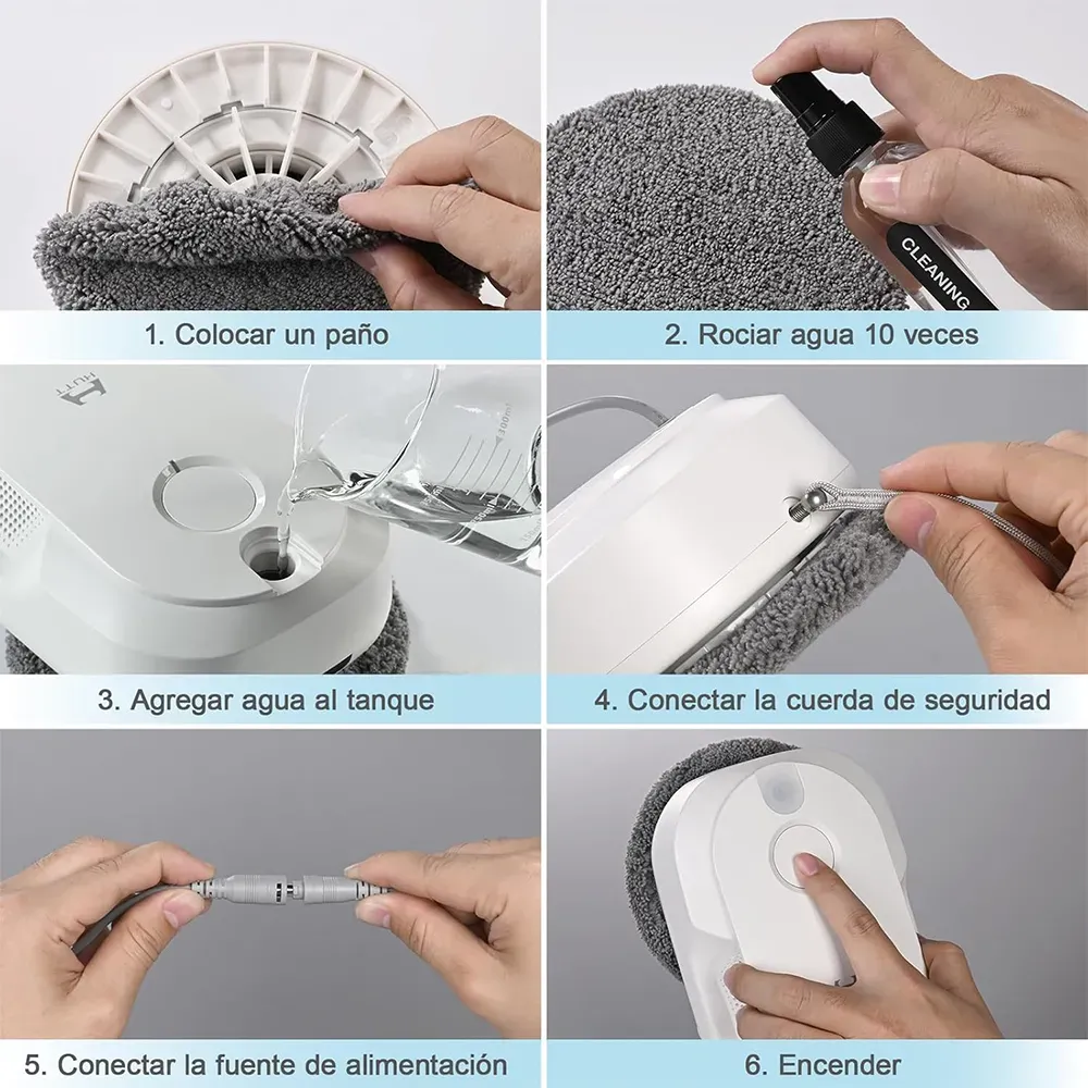 Unlike older models that require manually wetting the pads, the HUTT DDC56 integrates a bidirectional water spray system. Its nozzles atomize water into microscopic particles thanks to ultrasonic technology, distributing moisture evenly across the glass. With its 60 ml tank, it is capable of cleaning large surfaces without constant refills, effectively removing dried stains and stubborn dirt.