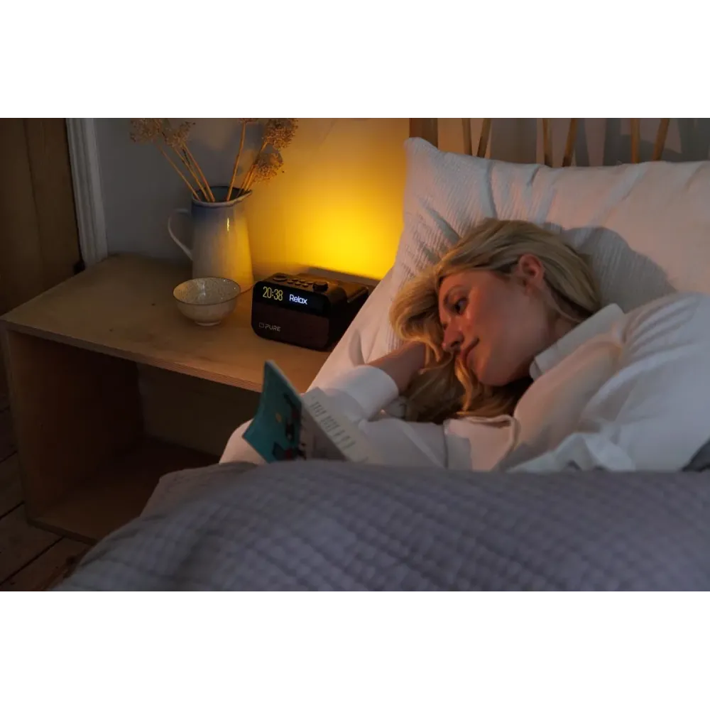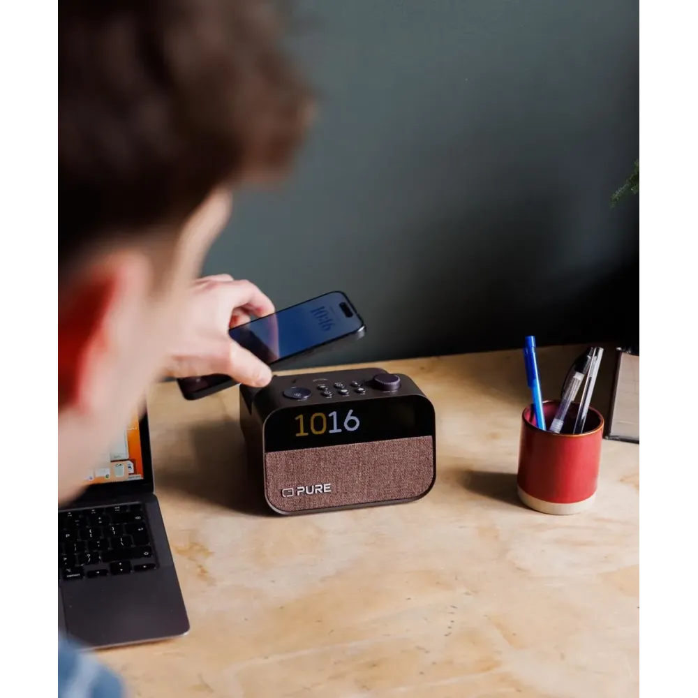 Maximize the functionality of your bedside table with Moment Charge Black Coffee, the audio system that boosts your well-being and keeps you connected. Enjoy 10W surround sound thanks to its two drivers, perfect for music or its 20+ natural sounds and white noise that guarantee a restful sleep. Wake up gently with the dimmable dawn light and keep your devices ready with the convenient built-in wireless charging and additional USB ports. With DAB+/FM radio and a sophisticated design, Moment Charge is the centerpiece for **sleep hygiene** and a perfect morning.