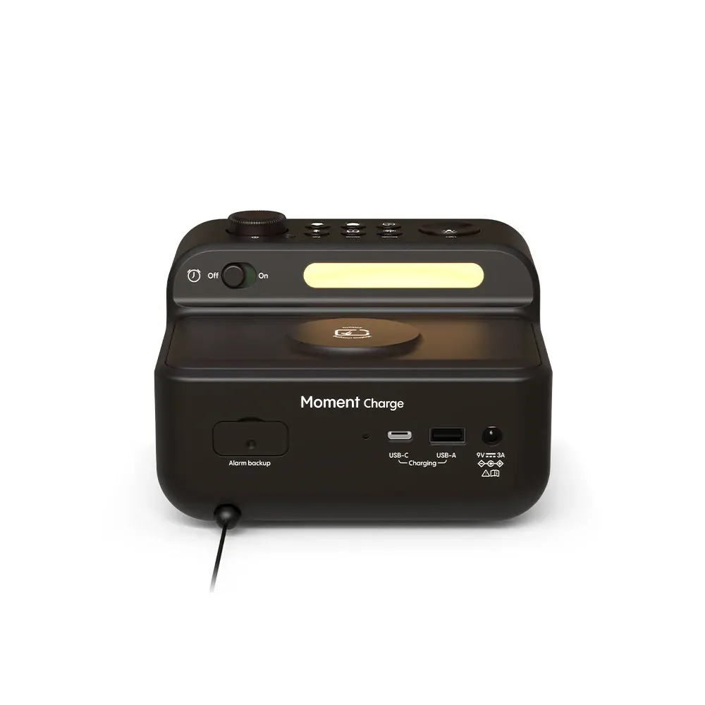 Eliminate cable clutter from your bedside table. Moment Charge incorporates an advanced Qi wireless charging pad on top, allowing you to recharge your smartphone effortlessly while you sleep. For other devices, **USB-A and USB-C** charging ports are included, consolidating all your power needs into one sleek device.