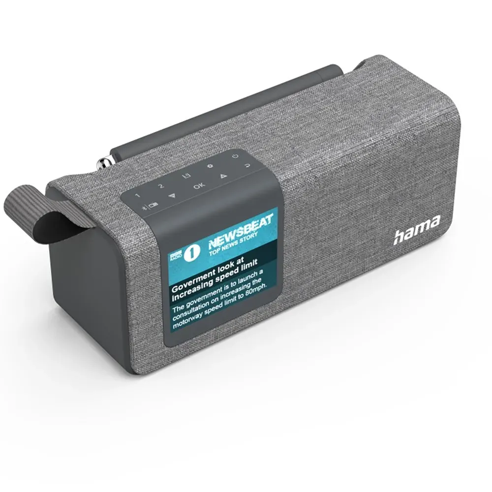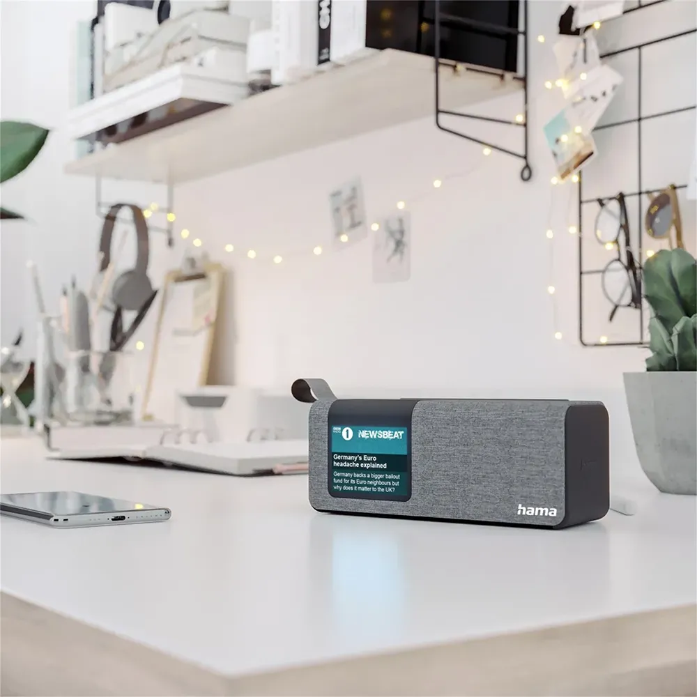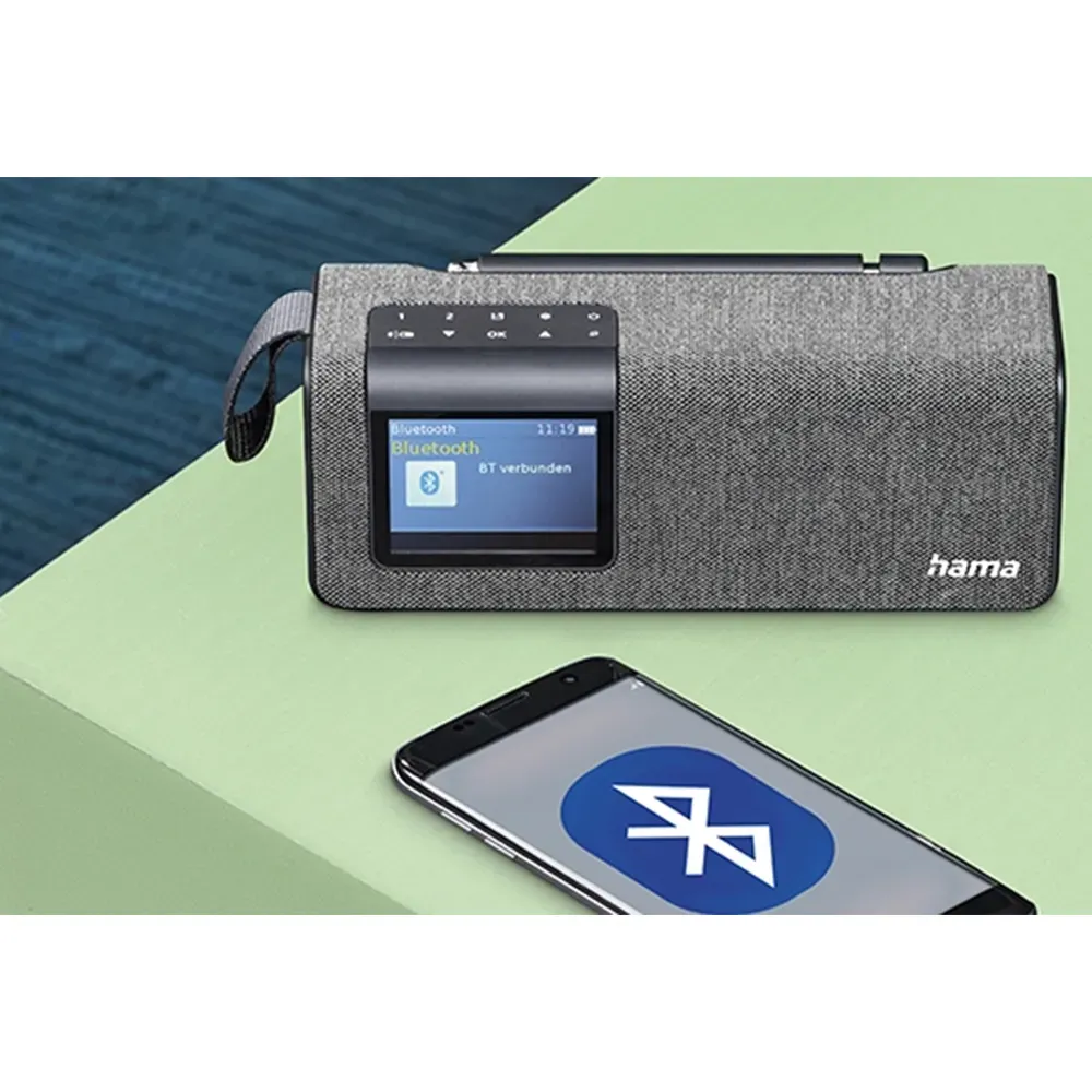La Hama DR200BT es una radio digital portátil y altavoz Bluetooth que combina recepción DAB+/FM, conectividad Bluetooth 5.0, altavoz de 5 W RMS y hasta 8 horas de autonomía con batería recargable —ideal para disfrutar tu música y emisoras favoritas en casa o en movilidad.