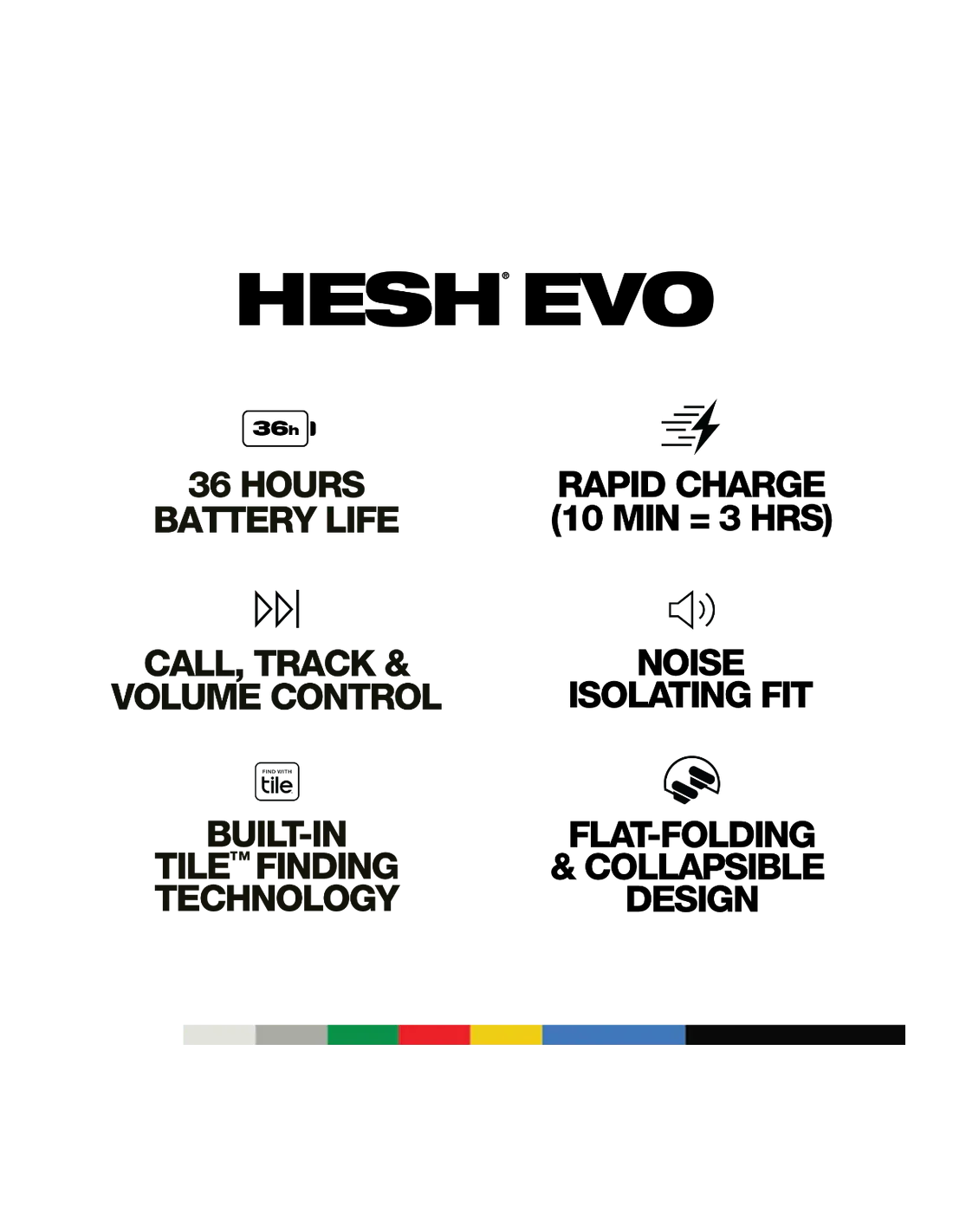 Los Hesh Evo ofrecen una calidad de sonido superior con transductores de 40 mm, proporcionando un sonido nítido y lleno de matices. Con una duración de batería de hasta 36 horas y carga rápida (10 minutos = 3 horas), estos cascos ofrecen un excelente rendimiento a un precio accesible. Equipados con Bluetooth® 5.0, aislamiento acústico y la tecnología de localización Tile™, los Hesh Evo son perfectos para quienes buscan comodidad, conexión automática y un diseño plegable. Incluyen cable USB-C, cable AUX y manual.