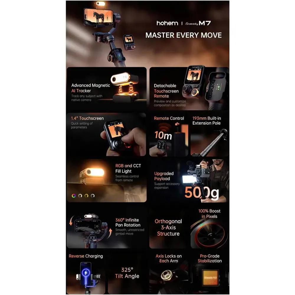 Lleva tus grabaciones al nivel cinematográfico con el Hohem iSteady M7 Premium, el estabilizador más potente de su clase. Su innovador control remoto desmontable con pantalla táctil de 1.4" te permite previsualizar la imagen y seleccionar objetivos de rastreo a distancia. Equipado con un sensor de IA magnético avanzado, sigue personas, mascotas y objetos usando la cámara nativa de tu móvil. Gracias a sus motores de alto par, soporta una carga útil de 500g, ideal para el iPhone 16 Pro Max o móviles plegables. Con rotación infinita 360°, luz RGB integrada y barra extensible, es la herramienta definitiva para creadores exigentes.