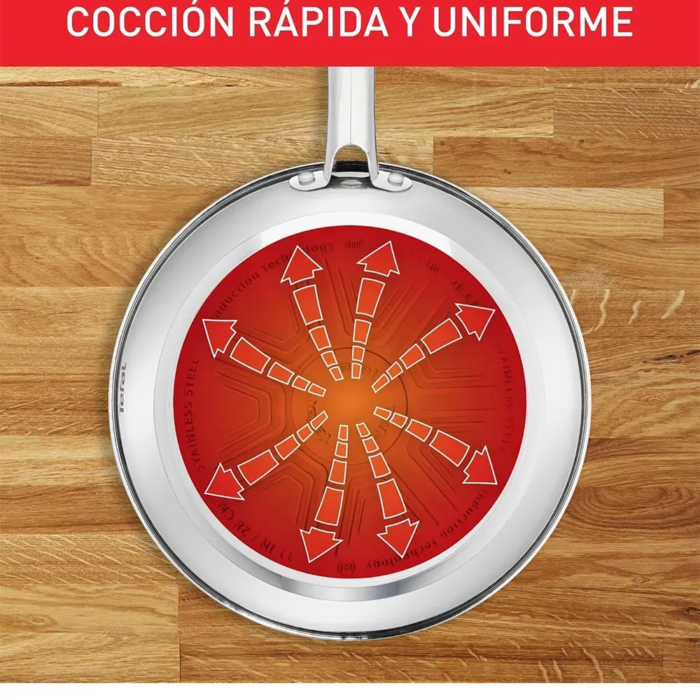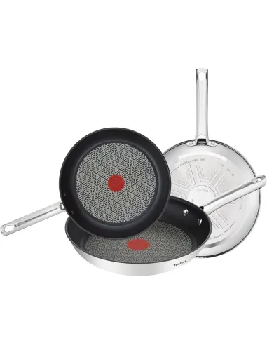 Contenido: sartenes de 20 cm, 24 cm y 28 cm. Material cuerpo: acero inoxidable (grado 18/10 en algunas versiones) con revestimiento antiadherente. Indicador Thermo‑Spot que se vuelve completamente rojo cuando la sartén está a la temperatura ideal. Compatible con gas, vitrocerámica, eléctrica e inducción. Apto para lavavajillas. Revestimiento libre de PFOA, plomo (Pb) y cadmio (Cd). Base con tecnología de inducción avanzada para difusión uniforme del calor. Mangos remachados en acero inoxidable. Garantía de durabilidad declarada por fabricante.