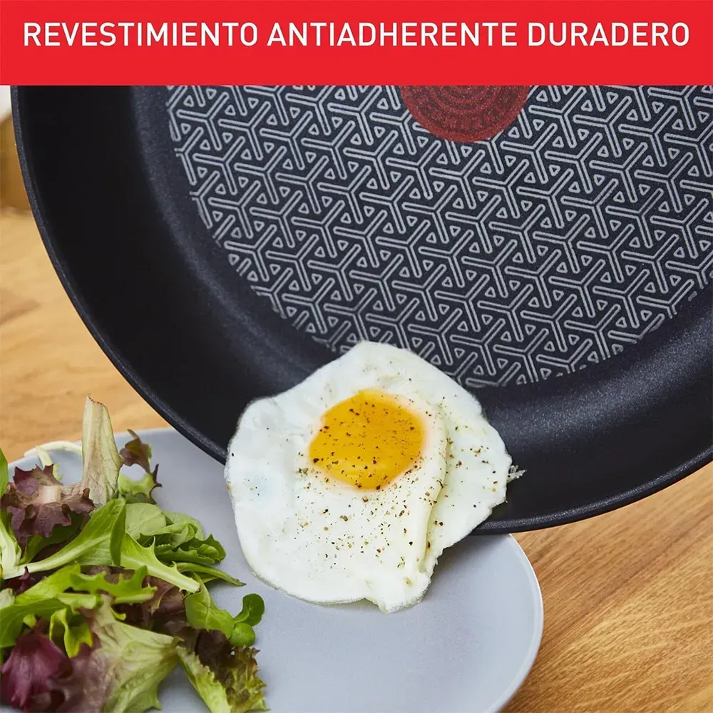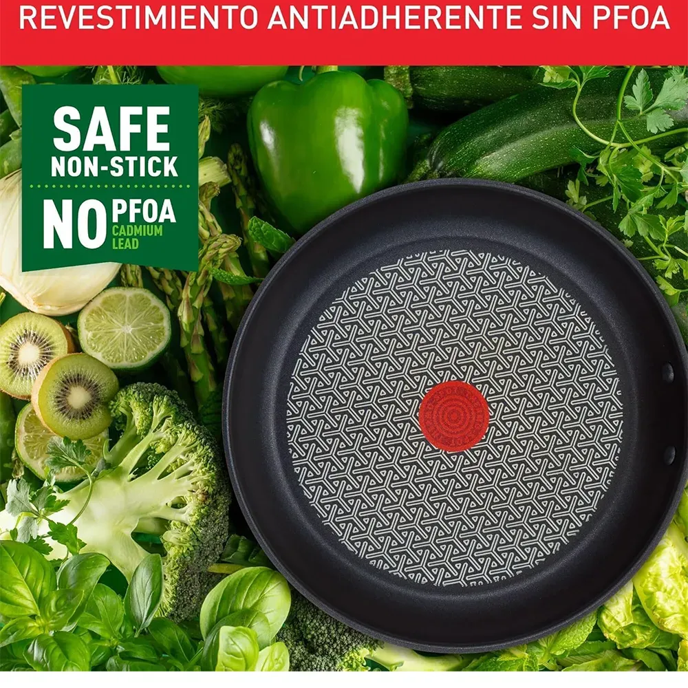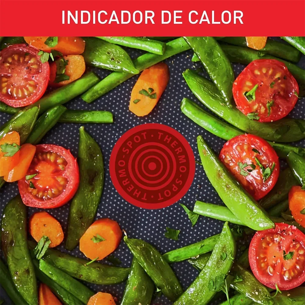 Este set de tres sartenes (20, 24 y 28 cm) te proporciona versatilidad para toda la cocina: desde pequeños salteados hasta platos para varios comensales. El cuerpo en acero inoxidable de alta calidad garantiza durabilidad y resistencia al uso diario. Gracias al indicador Thermo‑Spot, sabrás exactamente cuándo la sartén ha alcanzado la temperatura óptima para cocinar, lo que mejora el sabor, textura y presentación de tus platos. Todo ello con un rendimiento antiadherente seguro, al estar libre de PFOA, plomo y cadmio.