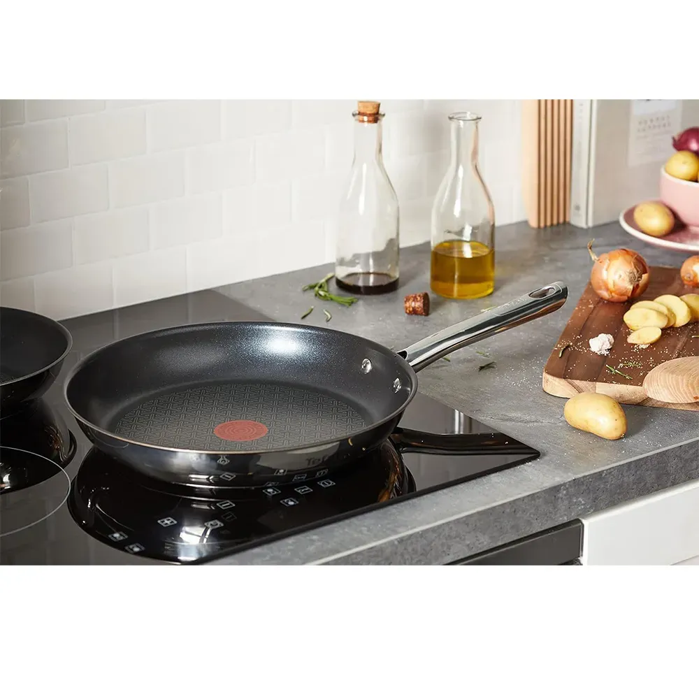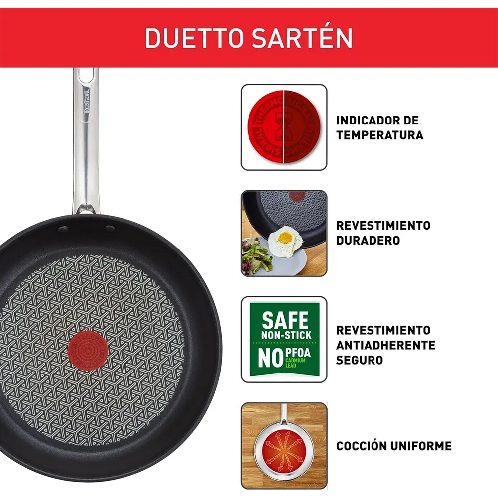 Disfruta de una cocina más ágil con el juego de sartenes Tefal Duetto 20/24/28 cm, fabricado en acero inoxidable de alta calidad, compatible con inducción, con tecnología Thermo‑Spot que indica la temperatura óptima, y un revestimiento antiadherente libre de PFOA para cocinar sin esfuerzo y limpiar fácilmente.