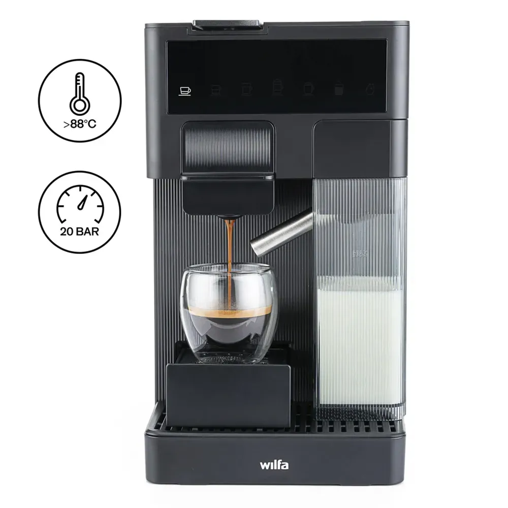 Descubre la Wilfa Volo Multi MMA1T‑TCM20, una cafetera multifunción que combina cápsulas (Nespresso, Dolce Gusto) y café molido para que disfrutes de tu taza perfecta con un solo toque. Su diseño compacto y elegante se adapta a cualquier cocina, su depósito de agua extraíble facilita el uso y limpieza, y su contenedor de leche desmontable con boquilla de vapor te permite preparar capuccinos y latte macchiatos como un barista. Vive la libertad de elegir tu formato de café favorito y saborea cada momento.
