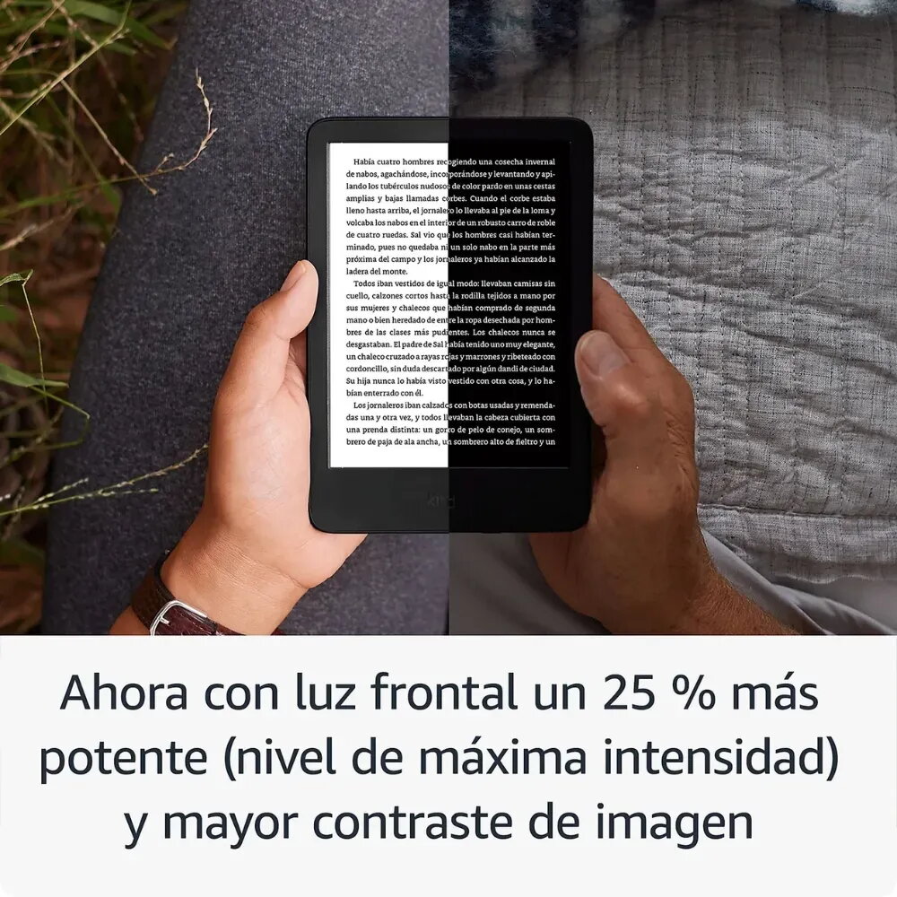 Su pantalla de 6 pulgadas cuenta con una asombrosa resolución de 300 ppp. Disfrutarás de textos e imágenes increíblemente nítidos que simulan a la perfección el papel impreso. A diferencia de las tablets, la pantalla de tinta electrónica (E-Ink) del Kindle no tiene reflejos, permitiéndote leer a plena luz del sol en la playa o el parque. Además, la luz frontal ajustable es ahora un 25% más potente en su nivel máximo e incluye modo oscuro para leer cómodamente por la noche.