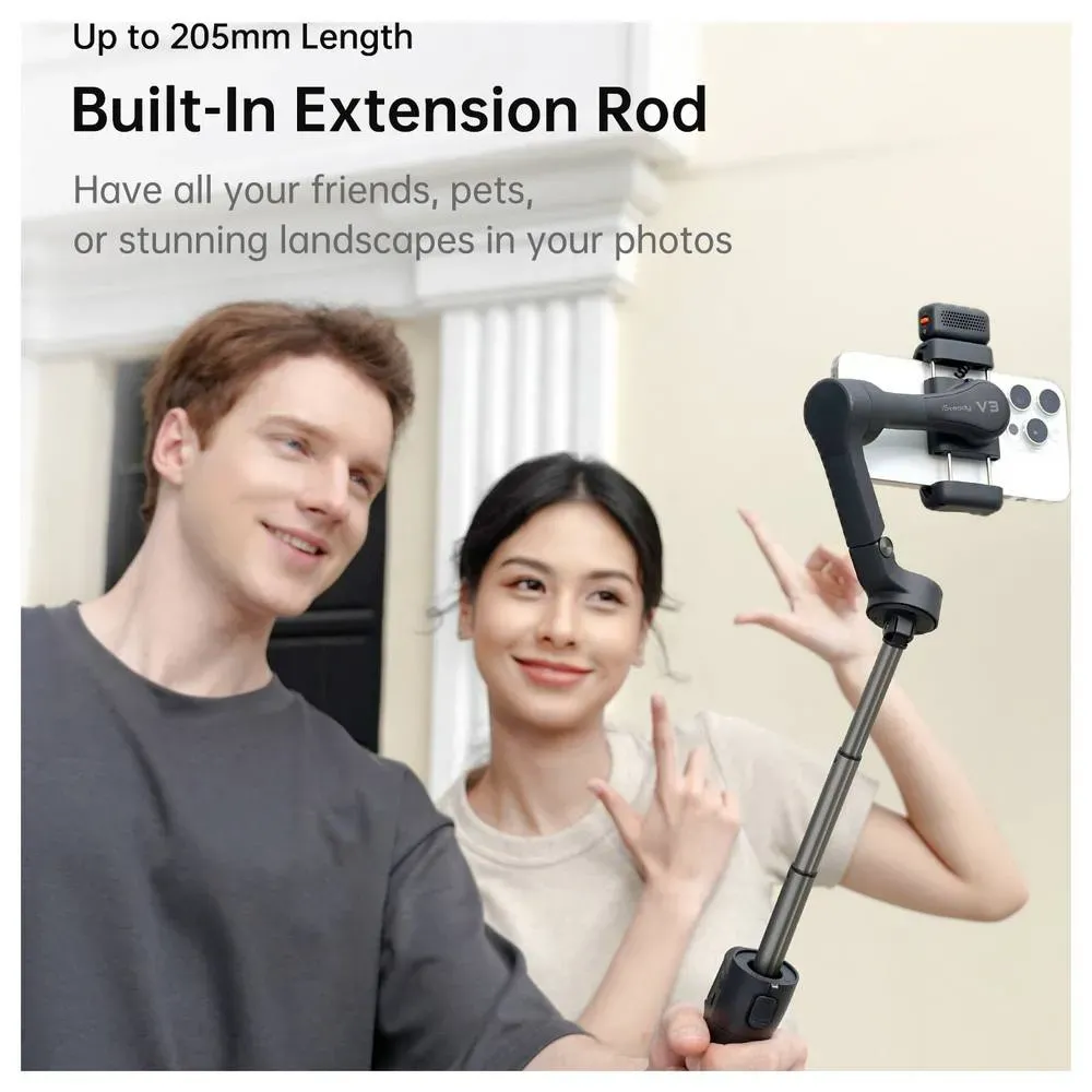 Diseñado para la máxima versatilidad, el iSteady V3 incorpora una barra de extensión de 205 mm ideal para selfies panorámicos y ángulos picados o contrapicados sin esfuerzo. Su mango se despliega para convertirse en un trípode estable. Además, cuenta con un control remoto desmontable que te permite manejar el gimbal a distancia o acoplarlo al mango para que se cargue mientras grabas.