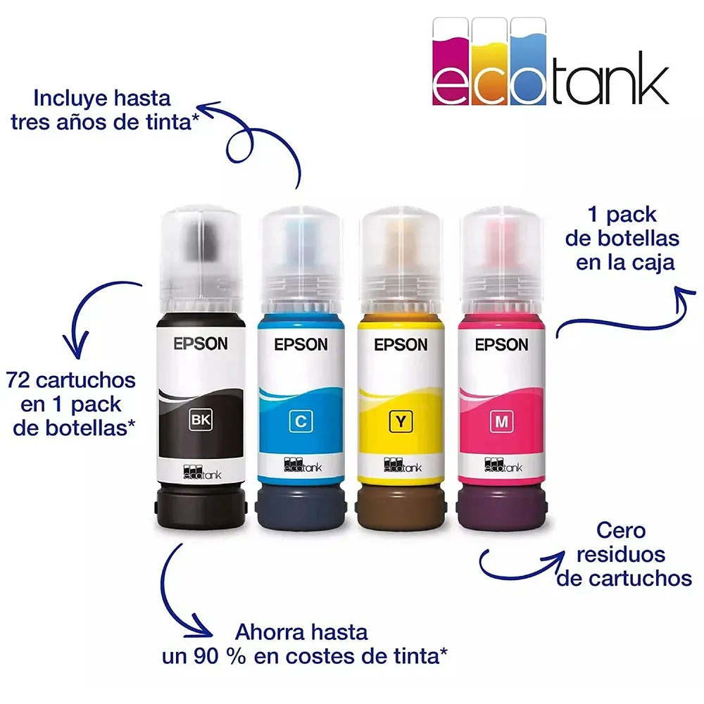 Imprime con tranquilidad. Este modelo incluye en la caja un juego de botellas de tinta equivalente a 72 cartuchos tradicionales. Esto te permite imprimir hasta 4.500 páginas en blanco y negro y 7.500 en color sin tener que comprar recambios. Es la opción ideal para hogares con alto volumen de impresión que buscan reducir el coste por página al mínimo.