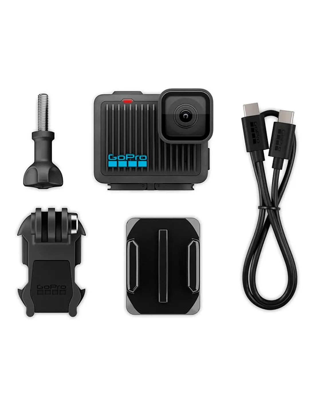 El paquete de la HERO incluye todo lo necesario para comenzar a grabar tus aventuras: cámara HERO, soporte adhesivo curvo, hebilla de montaje, tornillo y cable USB-C. Con estos accesorios, estarás listo para capturar cada instante de tu viaje, sin importar dónde te encuentres.