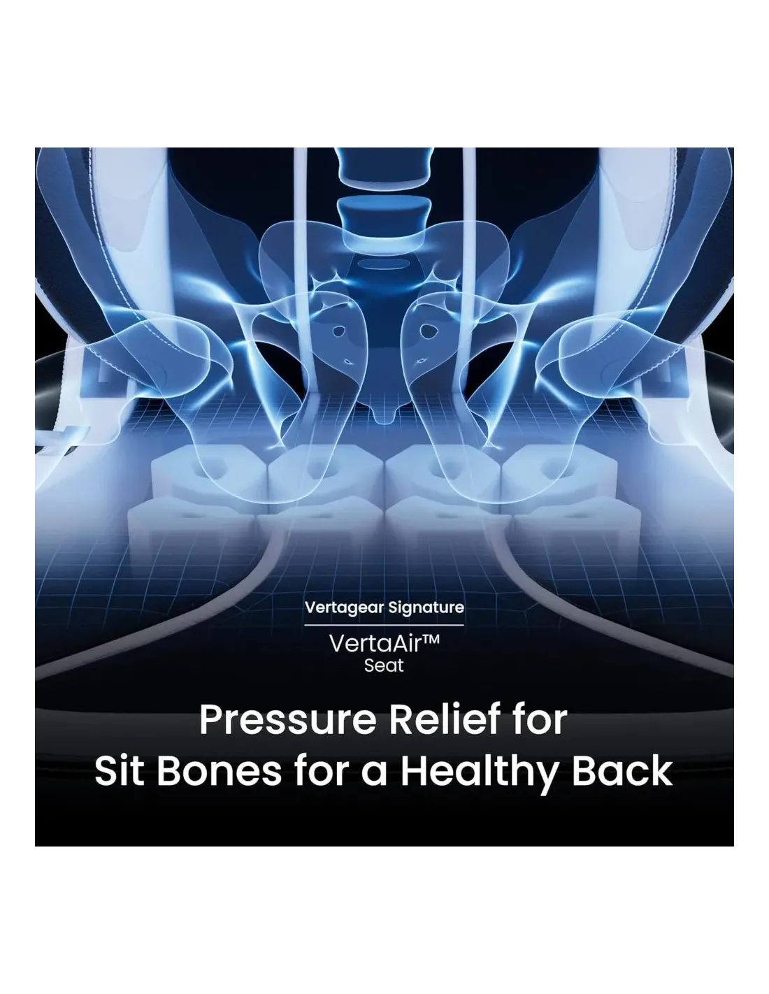 El exclusivo asiento VertaAir incluye ocho pilares de aire hexagonales basados en el Principio de Bernoulli, con canales de aire de 4 vías que mejoran la ventilación y distribuyen la presión de forma eficiente. Esto proporciona un alivio eficaz para el dolor crónico de espalda y un soporte uniforme para todo el cuerpo.