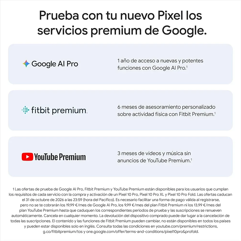 Descubre el Google Pixel 10 Pro, la cumbre de la IA móvil. Equipado con el revolucionario chip Tensor G5 y Gemini integrado, redefine la potencia y la creatividad. Captura la realidad como nunca antes con su cámara triple profesional (50MP principal), capaz de grabar en vídeo 8K y alcanzar un Zoom Pro Res de 100x. Sumérgete en su impresionante pantalla Super Actua de 6.3" a 120Hz, la más brillante de Pixel. Con 16GB de RAM, batería de larga duración y carga magnética PixelSnap, es el móvil definitivo para creadores y profesionales.