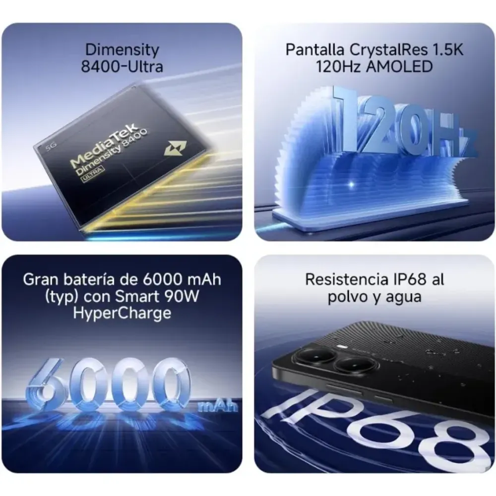 Su panel CrystalRes AMOLED de 6.67 pulgadas te sumerge en una calidad visual premium. Con resolución 1.5K, 120 Hz de tasa de refresco y un brillo máximo asombroso de 3200 nits, disfrutarás de colores vivos y un contraste HDR inigualable. Además, incluye tecnología Wet Touch para funcionar perfectamente con la pantalla mojada. Para seguir tu ritmo, su inmensa batería de 6000 mAh proporciona hasta 14.5 horas de uso continuo y soporta HyperCharge de 90W, recargando el 100% en solo 42 minutos.