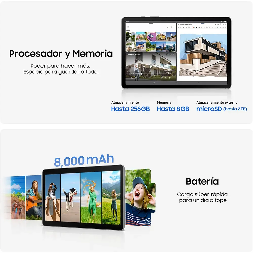Equipada con el procesador Exynos 1380 de 8 núcleos y 8 GB de memoria RAM, la Tab S10 Lite gestiona la multitarea sin esfuerzo. Edita documentos, navega y haz videollamadas simultáneamente sin retardos. Con 256 GB de almacenamiento interno, tendrás espacio de sobra para todas tus apps y archivos, y si necesitas más, es ampliable hasta 2 TB mediante tarjeta microSD.