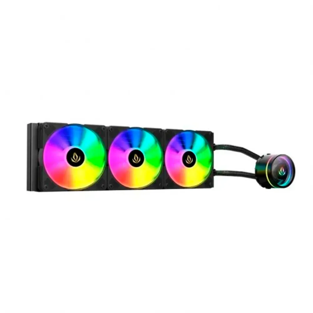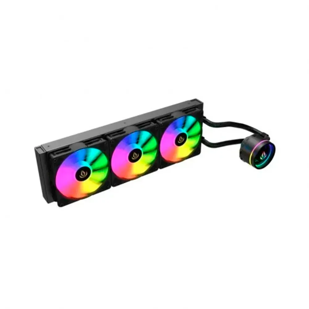 Los tres ventiladores de 120mm incluidos no solo brillan con ARGB, sino que también rinden. Cuentan con control PWM, permitiendo que su velocidad se ajuste automáticamente entre 600 y 1800 RPM según la necesidad. Con un impresionante flujo de aire de 69.5 CFM y una presión estática de 3.2 mmH2O, están diseñados para mover aire eficientemente a través del denso radiador de aluminio, disipando el calor de forma efectiva.